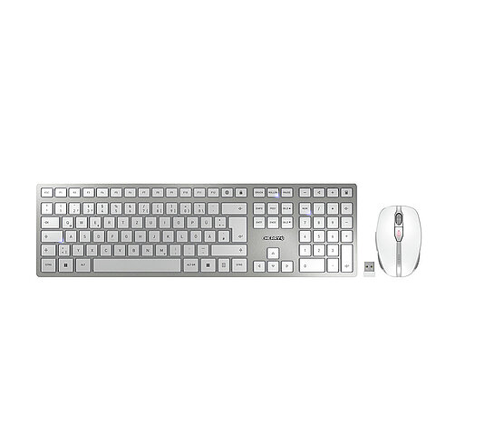 Das CHERRY DW 9000 SLIM Desktop-Set begeistert durch innovative Funktionen, herausragende Verarbeitung und trendiges, flaches Design. Maus und Tastatur lassen sich wahlweise mit dem beiliegenden 2,4 GHz-Funk USB-Empfänger oder per Bluetooth® verbinden. Durch einen Schalter an der Maus bzw. Tastatur wechseln sie blitzschnell zwischen diesen Verbindungsarten. So lässt sich z.B. ein Notebook per Bluetooth® und zusätzlich ein PC über Funk mit dem gleichen Desktop bedienen. Die Übertragung der Daten erfolgt in beiden Fällen mit einer AES-128-Verschlüsselung.