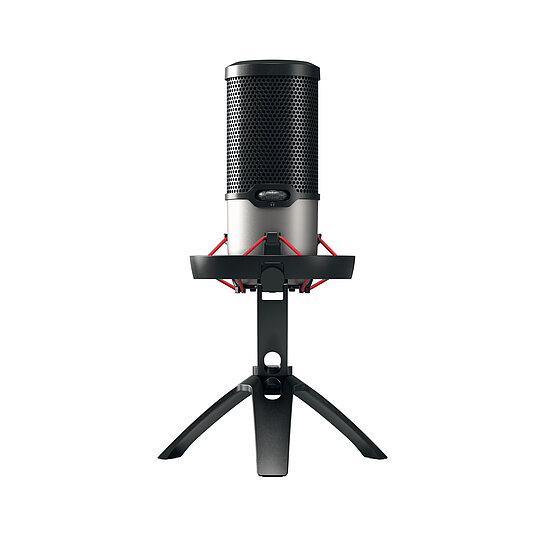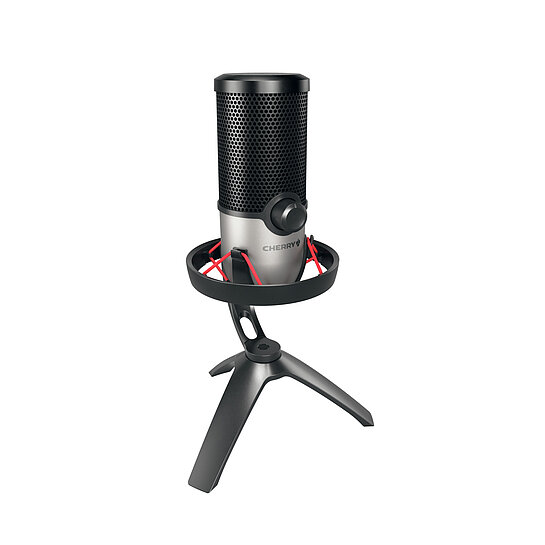 Was bei diesem Streaming-Mikrofon sofort ins Auge fällt, ist die hochwertige Verarbeitung: Der dreibeinige Fuß besteht komplett aus Metall und sorgt so jederzeit für einen festen und sicheren Stand. Das minimalistische Design in Schwarz mit mattem Silber wirkt dezent und edel zugleich. Als optisches Highlight verleihen die Gummibänder für die Shock-Mount-Funktion dem Mikrofon den letzten Schliff. Diese sind ganz im vertrauten CHERRY-Rot gehalten - designed in Germany.