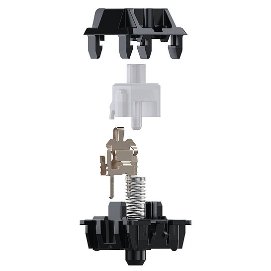 A CAD high-precision component made of plastic polymer specifically for the Cherry MX creates the pre travel and the keystroke feel between the upper housing and coil spring. The key cap is attached on the upper part of the stem.This white switching slide is responsible for the tactile switch characteristics of the CHERRY MX CLEAR. Due to the bulge on the TLS Surface, the switch sends a noticeable feedback, which communicates the exact position of the trigger to the user.