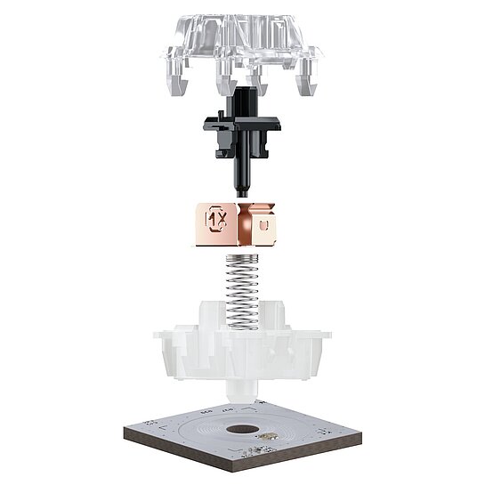 Dual-functional, the housing base component is made of a POM derivate, ensuring an ultra-smooth switch feeling. The inner part forms the mounting for the CHERRY MX switching mechanism. The outer part is both the base and mounting surface for mechanical keyboards.The bottom housing is translucent and has a recess for the SMD LED on the circuit board.