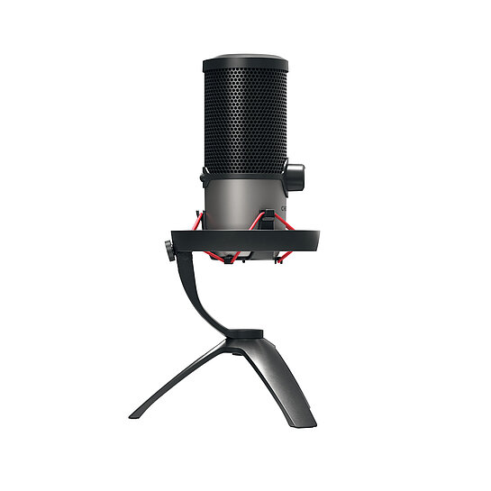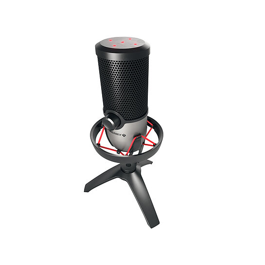 What immediately catches your eye with this streaming microphone is the high-quality workmanship: The three-legged design stand of the USB microphone is made entirely of metal and thus provides a firm and stable base at all times. The minimalist design in black with matte silver looks both discreet and classy. As a visual highlight, the rubber bands for the shock mount function give the microphone that finishing touch. These are in the classic CHERRY red – designed in Germany.