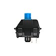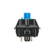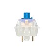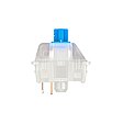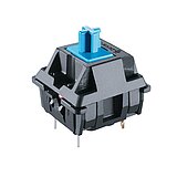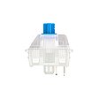 Un componente CAD de alta precisión fabricado en polímero plástico específicamente para el Cherry MX crea el recorrido previo y la sensación de pulsación entre la carcasa superior y el muelle helicoidal. La tapa de la tecla se fija en la parte superior del vástago.La corredera de conmutación del CHERRY MX BLUE consta de dos partes. En cuanto se pulsa el interruptor y el componente blanco golpea la potencia azul después del punto táctil y desciende, se activa un «sonido de clic». Debido a la protuberancia de la superficie TLS, el interruptor también envía una respuesta acústica además de la perceptible, lo que significa que se comunica al usuario la posición exacta del gatillo.