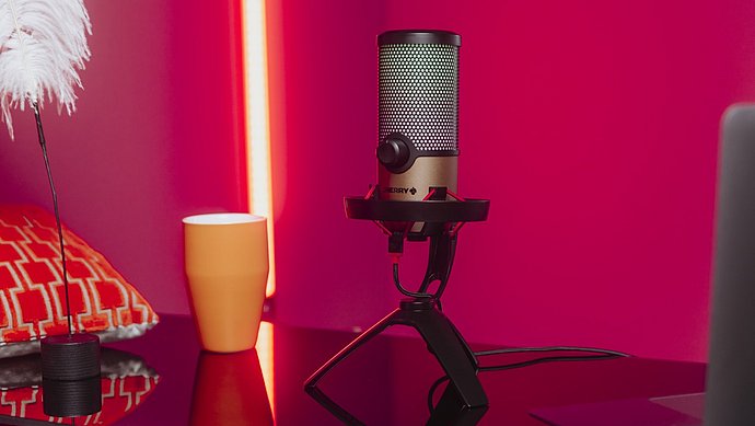 El CHERRY UM 9.0 PRO RGB no solo se destaca por su base de tres patas de metal macizo, que garantiza un firme apoyo, sino que además tiene un aspecto estupendo: la elegante combinación de negro mate y cobre convierte al micrófono USB profesional en el centro de todas las miradas.
