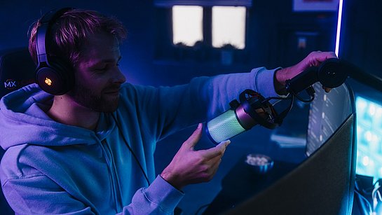 Dale a tu sesión de streaming o a la configuración de tu oficina un toque propio y una nota de color: con el micrófono UM 9.0 PRO RGB, puedes elegir entre diferentes colores o un efecto arco iris y diseñar tu espacio de trabajo a tu gusto. ¿Verde intenso, azul radiante o mejor una degradación tonal desde el rosa fuerte al turquesa brillante? La decisión es totalmente tuya. ¿O prefieres algo más discreto? Naturalmente, el micrófono para juegos también se puede utilizar sin iluminación RGB.