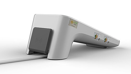 The true strengths of the eHealth terminal lie within: Four card slots and a contactless reader enable authentication and connection to the digital healthcare network - the telematics infrastructure. The electronic health card (eGK) and the health professional card (HBA) can be accommodated here, as can the SMC-B and gSMC-KT. An ESD discharge for electrostatically charged cards ensures stable operation in all seasons.