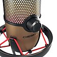 CHERRY UM 9.0 PRO RGB 不僅擁有由堅固金屬打造的極穩固三腳底座,其霧面黑搭配雅緻銅色的設計,更是視覺焦點,使這款專業 USB 麥克風格外引人注目。